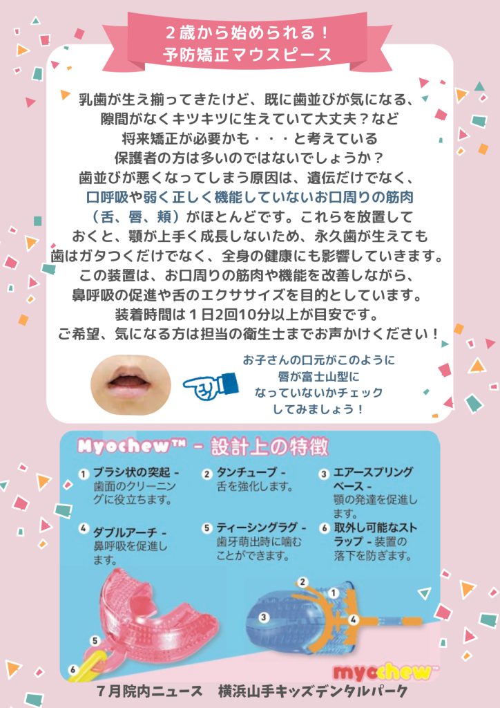 院内ニュースには、乳歯が生え揃った後の歯並びに対する予防マウスピースをご紹介しておりますので是非待合室でお読み下さい!
