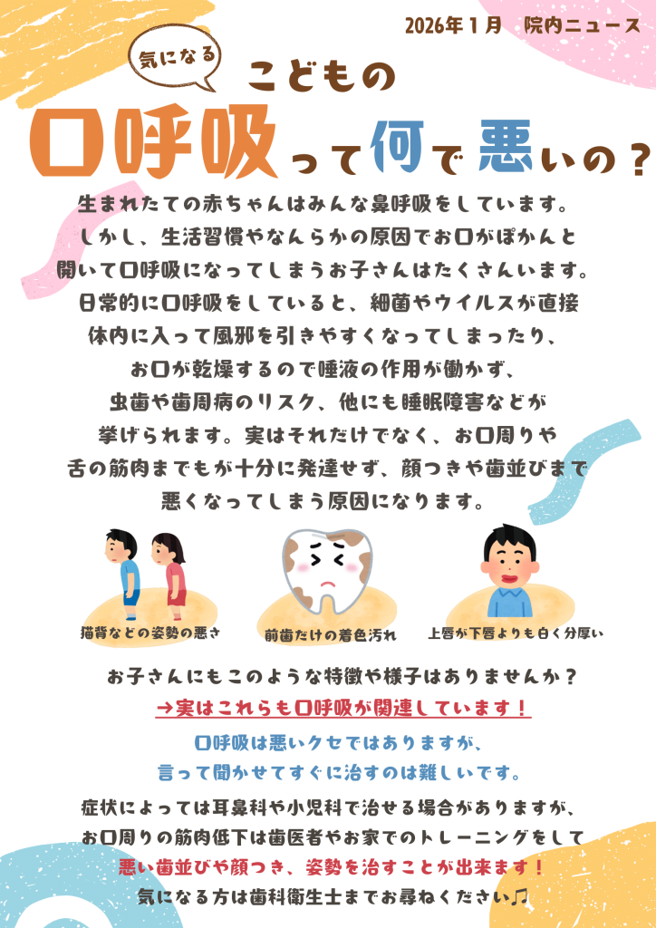こんにちは 横浜山手キッズデンタルパークからのお知らせです。最新の院内ニュース11月号が待合室に掲示されました。 今月のテーマは「こどもの口呼吸って何で悪いの?」です。院内ニュースには口呼吸のデメリットなどをご紹介しておりますので是非待合室...